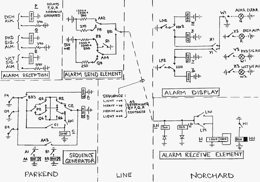 The circuit uses four main DC signals over the alarm wire, ie a light negative condition (a 2400 ohm 50 volts negative signal), a heavy negative (a 250 ohm 50 volts negative signal), a heavy positive signal, and a light positive signal. These signals are applied one after the other as required to indicate the alarms present at Parkend. The main practical problem was in finding relays that would distinguish these four conditions coming from Parkend via the single alarm wire. Relays LN and LP at Norchard needed to have a low operate voltage (4 volts)to operate to the 2400 ohm battery condition. Lightly loaded 500 ohm relays with very full windings and diodes to distinguish the direction of current flow fulfilled this requirement. Relay H needed to operate only to the heavy condition. A relay using only one of the two windings on the core and with a fairly heavy spring load and an operate value of 17 volts was found to be suitable. Luckily the railway has a large stock of 3000 type relays to choose from. One problem became apparent. The H relay being more heavily loaded than the LN relay, released faster when the alarm signal was not required. With LN still holding and H released, relay W produced a pulse and at W1 released any alarm relays already operated. We could only overcome this problem by first slugging the H relay by shorting its second winding and by also adding a slow to release relief relay HH. This in turn meant that the sending of sequential signals from Parkend had to be slowed down as well. This was achieved by the addition of the slow to operate and release AA and BB relays. Circuit Operation At Parkend, there are three relays, P, Q and R which are normally held operated by a loop when there are no alarms. P4, Q4 and R4 prevent relays A, AA, B and BB from operating. With AA2 and BB1 released, a light negative condition is sent to line on the single wire to Norchard. This holds relay LN operated, but does not provide sufficient line current to flow to operate relay H. LN2 operates relay W which at W1 lights the green alarm clear lamp. W1 also ensures that relays X and Y are not held from any previous alarm condition. This is the normal standing condition. Should the power fail at Parkend or the cable become faulty, LN will release and the alarm clear lamp will dim. Should a fault occur then P, Q and/or R will release. Say relay P releases. P4 initiates a sequence of conditions on the wire to Norchard. P4 released, operates relay A and then AA. AA3 operates B and then BB. BB3 releases relay A and AA. Relays B and BB hold via P4 released, BB3 operated, P2 released, Q2 and R2 operated and C2 released. During this sequence the following conditions are sent to line, AA operates and at AA2 connects heavy negative to line, then BB1 operates and line condition is disconnected as AA4 is operated but Q8 is also operated. When AA4 releases the line is earthed. At Norchard, we started with LN and W operated. When the heavy negative condition occurs relays H and HH also operate. LN2 and HH2 release W and operate relay X which holds via X1 to the W1 earth. X3 lights the alarm lamp appropriate to the original P relay. When the line becomes disconnected or an earth is present, relays LN, H and HH release, but X remains held to the W1 earth. If any further faults occur after the first has been sent and registered, the P, Q, R and C contact arrangement ensures that any movement of P, Q and R will cause the release of B and BB, the reoperation of A and AA, the reoperation of B and BB which will then hold to any P4, Q4 and R4 earth. The sequence is