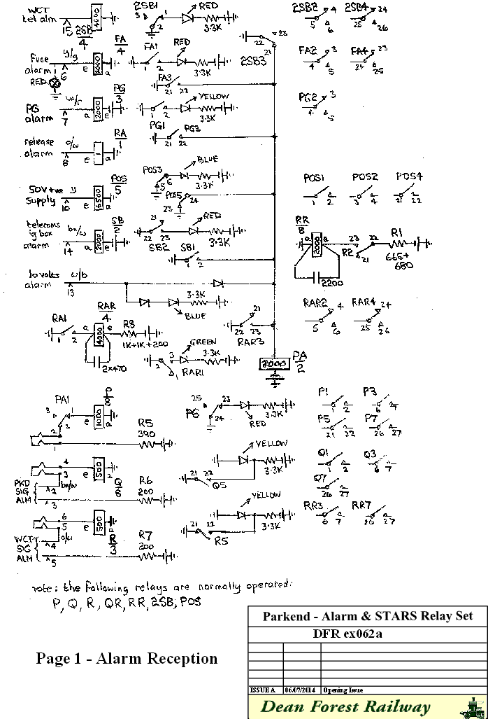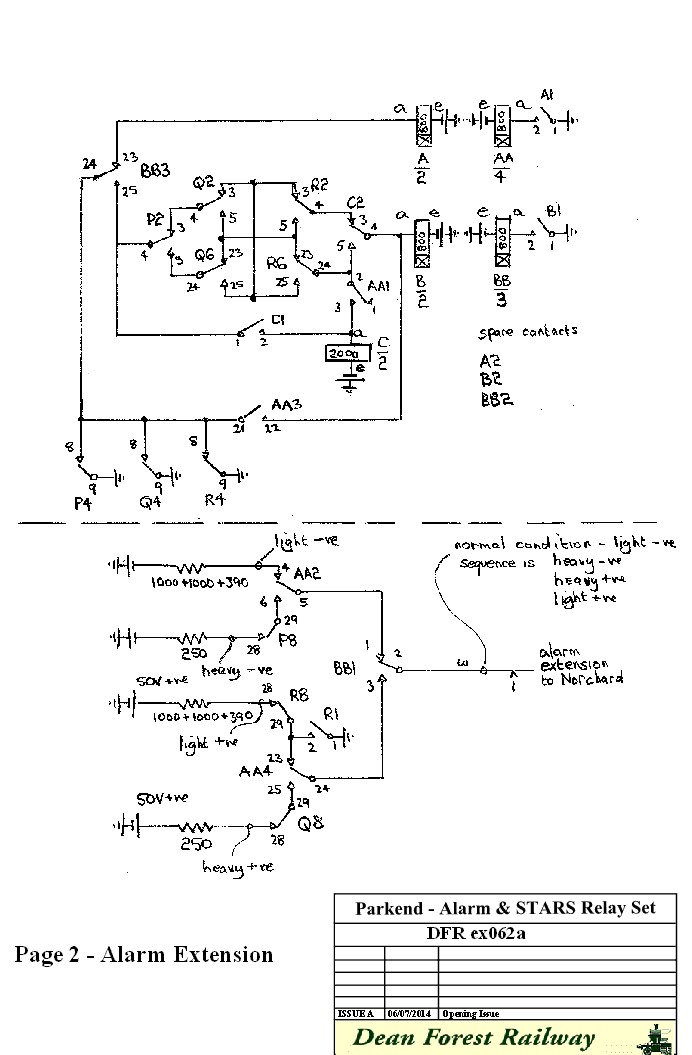 Fuse Alarm. Normally relay FA is released until a blown fuse places a battery condition on the FA wire on the common services block. This in turn operates relay FA. FA1 lights a red LED within the relay set can. FA3 operates relay PA. PA1 releases relay P. P6 lights the red LED in the test jack to indicate an exchange alarm. The release of relay P initiates the alarm extension circuit to send the exchange alarm condition to Norchard. We have retained the red main fuse alarm lamp which also operates to a battery on the FA lead. PG Alarm. Normally relay PG is released until a line circuit held under fault conditions places an earth on the PG wire on the common services block. This in turn operates relay PG. PG1 lights a yellow LED within the relay set can. PG3 operates relay PA. PA1 releases relay P. P6 lights the red LED in the test jack to indicate an exchange alarm. The release of relay P initiates the alarm extension circuit to send the exchange alarm condition to Norchard. Release Alarm. Normally relay RA is released until a releasing selector places a battery condition on the RA wire on the common services block. This in turn operates relay RA. RA1 operates relay RAR after a two to 3 second delay. The delay is produced by the large capacitance placed across the RAR relay and the charging 2.2 kilohms resistor effect. This generally will prevent a normal release condition from operating relay RAR and the sending of a momentary alarm condition to Norchard. Should RAR operate to a persistent release alarm condition, RAR1 lights a green LED within the relay set can. RAR3 operates relay PA. PA1 releases relay P. P6 lights the red LED in the test jack to indicate an exchange alarm. The release of relay P initiates the alarm extension circuit to send the exchange alarm condition to Norchard. 50 Volts Positive Alarm. Normally relay POS is held operated by the 50 volt positive supply. Should the supply fail, relay POS releases. POS3 lights a red LED within the relay set can. POS5 operates relay PA. PA1 releases relay P. P6 lights the red LED in the test jack to indicate an exchange alarm. The release of relay P initiates the alarm extension circuit to send the exchange alarm condition to Norchard. Parkend Signal Box Telecoms Alarm. Normally relay SB is released until a fault in the telecoms equipment in the signal box presents an earth to the SB relay. SB2 lights a red LED within the relay set can. SB1 operates relay PA. PA1 releases relay P. P6 lights the red LED in the test jack to indicate an exchange alarm. The release of relay P initiates the alarm extension circuit to send the exchange alarm condition to Norchard. Whitecroft Signal Box Telecoms Alarm. Relay 2SB is normally held in by a battery condition received from the concentrator equipment at Whitecroft Box. If a telecoms fault occurs at Whitecroft, the battery condition is disconnected allowing relay 2SB to release. 2SB1 lights a red LED within the relay set can. 2SB3 operates relay PA which releases relay P. P6 lights the red LED in the test jack to indicate an exchange alarm. The release of relay P initiates the alarm extension circuit to send the exchange alarm condition to Norchard. Low Volts Alarm. Should the battery voltage "go low", this will place an earth onto U point 13 and light a red LED within the relay set can. The earth will also operate relay PA via the rectifier. PA1 releases relay P. P6 lights the red LED in the test jack to indicate an exchange alarm. The release of relay P initiates the alarm extension circuit to send the exchange alarm condition to Norchard. Parkend Signals Alarm Normally relay Q is held operated by a full loop from the signals equipment at Parkend. If a signals fault occurs, the full loop is replaced by a 6.8 Kilohm resistance. This will cause relay Q to release. Similarly a line disconnection will also cause relay Q to release. Q5 removes the short circuit from a yellow LED in the test jacks which lights. The release of relay Q initiates the alarm extension circuit to send the exchange alarm condition to Norchard. Whitecroft Signals Alarm Normally relay R is held operated by a full loop from the signals equipment at Parkend. If a signals fault occurs, the full loop is replaced by a 6.8 Kilohm resistance. This will cause relay R to release. Similarly a line disconnection will also cause relay R to release. The large capacitor across the R relay causes the relay to be quite slow to release. This ensures that if relays Q and R try to release simultaneously, say to a wide spread power failure, they follow in sequence. If Q and R released together then the new alarm condition would not be sent to Norchard. R5 removes the short circuit from a yellow LED in the test jacks which lights. The release of relay R initiates the alarm extension circuit to send the exchange alarm condition to Norchard. ALARM EXTENSION Before looking at the actual diagrams in use, it may help to consider the means by which multiple alarm conditions are fed from Parkend to Norchard exchange. This all relay method was suggested by Peter Wood from the Signalling Group and we are grateful to him for his ingenuity.