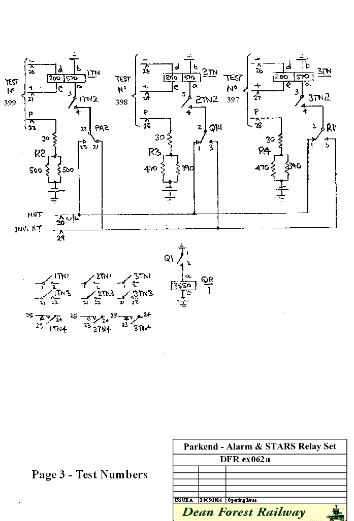 Three test number circuits have been provided within the relay set. Test number circuit one is controlled by the PA relay and so returns NU tone should there be an exchange fault. 399 is allocated to this circuit. Test number circuits 2 and 3 are controlled by relay Q and R and so can be used to indicate signals faults should the signals staff require this facility.