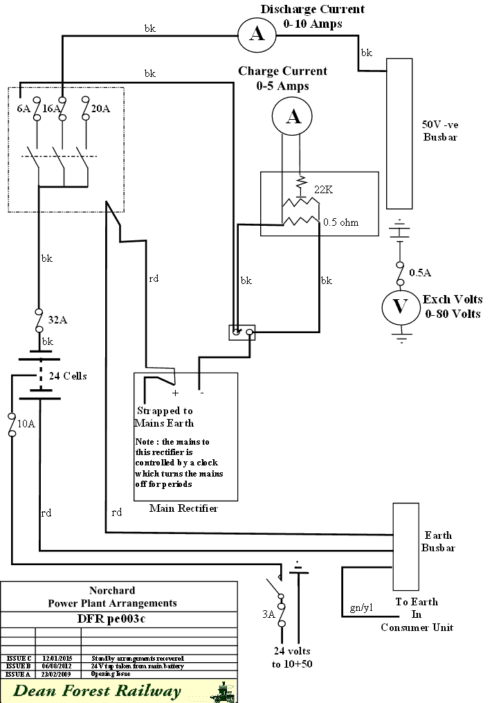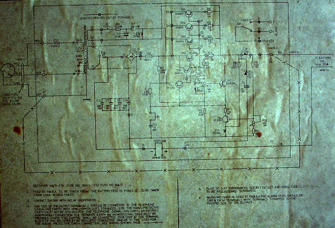 Norchard Exchange 50 Volt PowerThe rectifier supplies up to 7 amps of charge current but the output tracks the discharge current quite closely. There is a clock in the mains circuit which can be used to turn the rectifier on and off if required, but this facility is not used at present There is no standby rectifier apart from a portable device which would need to be clipped to the 50 volt rail should the main rectifier break down. The power supply normally places around 54 volts onto the exchange busbars. The voltage will drop to 48 should the mains be switched off for a working day. The three way switch and fuse box is mounted outside the locked exchange room so that the 50 volt battery can be disconnected easily should there be a fire or similar. There is also an isolating switch mounted outside the exchange which similarly removes all 240 volt mains supplies to the exchange room.
